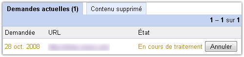 Précisez ensuite l’adresse de la page que vous voulez voir disparaître du net via le bouton + Nouvelle demande de suppression des GWMT. La suite de la procédure est très intuitive et vous mène au résultat suivant :